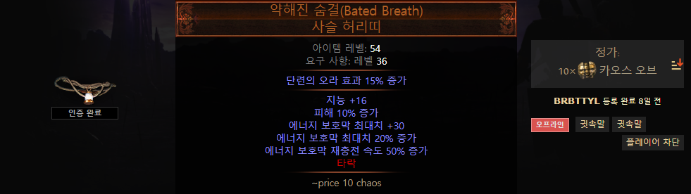 가격이 싸기 때문에 약해진 숨결을 선호 하지만 저항이나 능력치가 필요한 경우 명계의 죔틀 착용하는 것이 좋습니다.