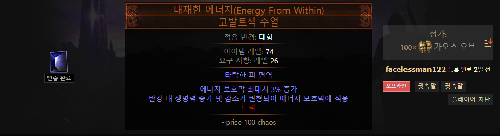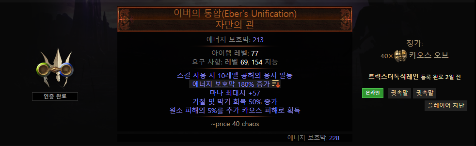 장갑 또한 마찬가지고, 상태 이상 이외의 지속 카오스 피해 배율 증가와 저항, 높은 에너지 보호막을 얻을 수 있다면 이상적입니다.