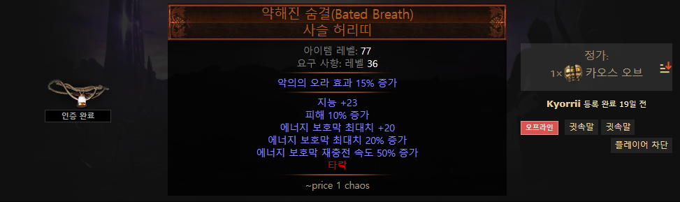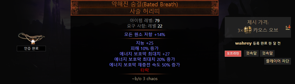 가격이 싸기 때문에 약해진 숨결을 선호 하지만 저항이나 능력치가 필요한 경우 명계의 죔틀 착용하는 것이 좋습니다.