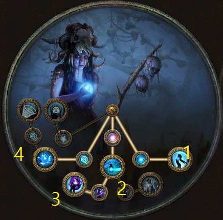 레벨링 예시 스킬 트리를 참고하시고, 3.6 리그에서는 파멸을 사용했다고 했으나 너프당했으니 현재 3.7에 맞춰서 정수 흡수를 사용하면 될 것입니다.