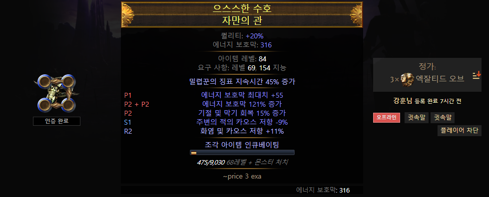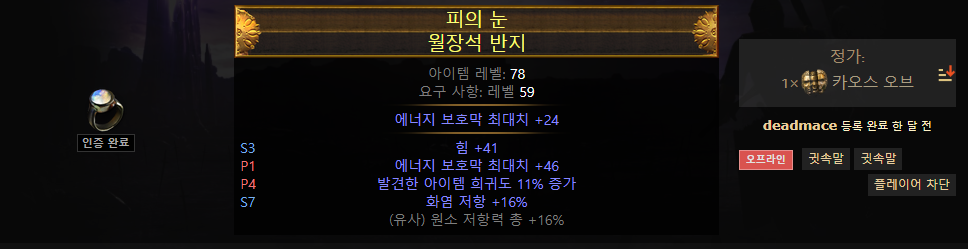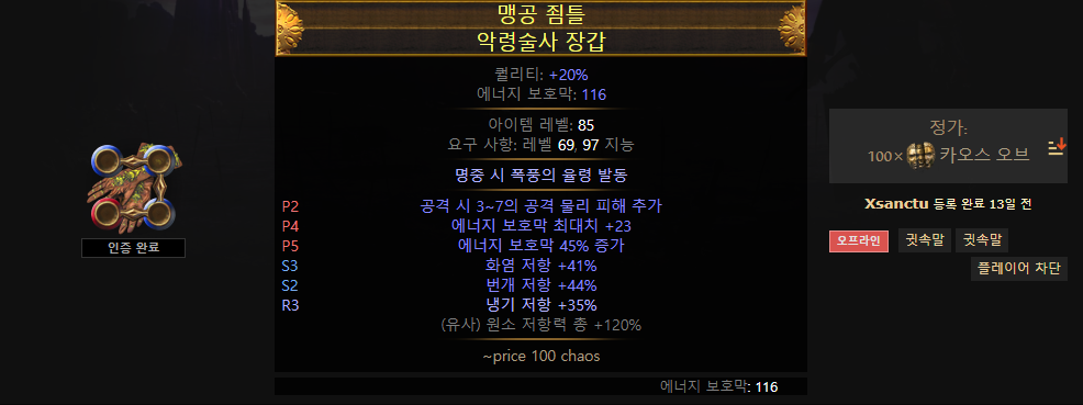 장갑 또한 마찬가지고, 상태 이상 이외의 지속 카오스 피해 배율 증가와 저항, 높은 에너지 보호막을 얻을 수 있다면 이상적입니다.