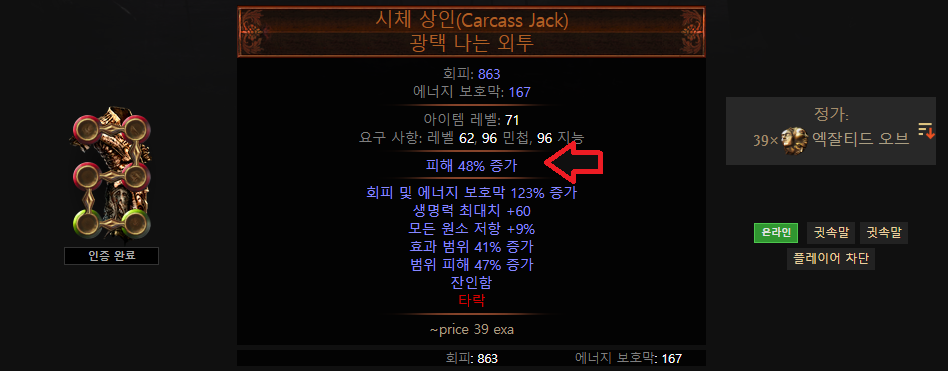 타락으로 인해 피해 증가가 붙은 시체 상인은 어마어마한 가격에 거래가 된다.