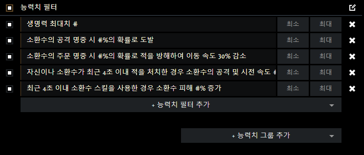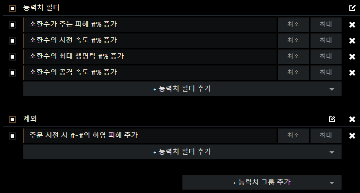 망령 소환 - 원소 집중 보조 - 소환수 피해 보조 - 화염 관통 보조 - 주문 메아리 보조 - 상위 다중 투사체 보조