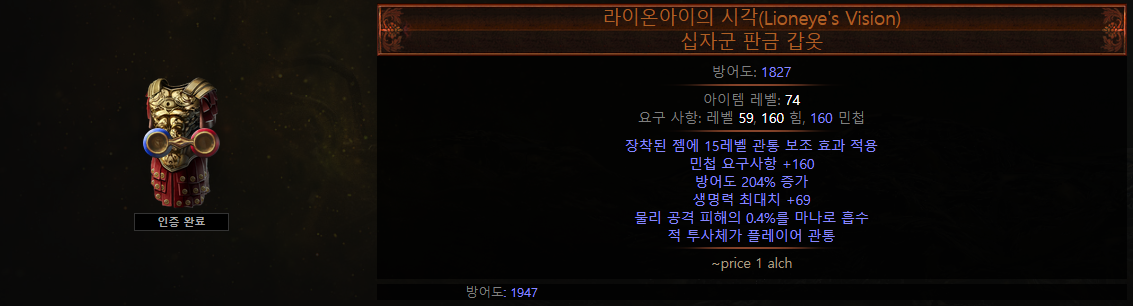 * 참고) 라이온아이의 시각 갑옷을 사용한다면 힘과 민첩을 160까지 올려야하고