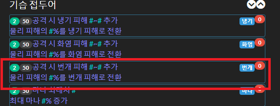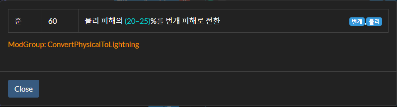 공격 시 번개 피해 # ~ # 추가는 필요 없는 옵션이지만 물리 피해의 #%를 번개 피해로 전환이 있는데