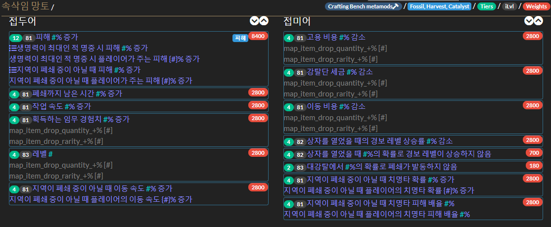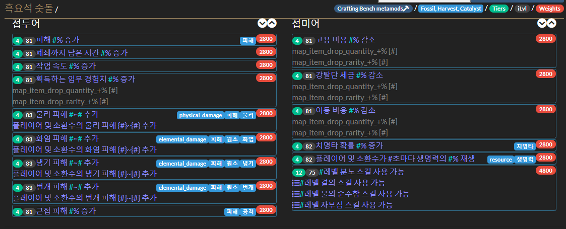 각 장비들은 접두, 접미 2개씩 총 4개의 옵션을 가질 수 있다.