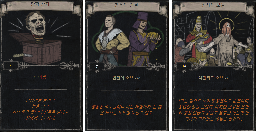항만에서 깜짝 상자는 로또 하듯이 까보는 거고, 행운의 연결과 성자의 보물이 메인