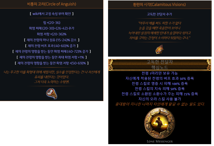 재의 전령의 버프를 극대화하기 위해 비통의 고리, 환란의 시각을 활용하는 것이 정석으로 보인다.