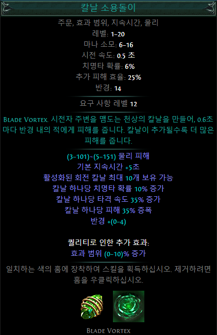 그럼 첫 칼날의 피해가 칼날 소용돌이의 피해를 정하므로 70% 피해 증폭과 100% 범위 증가를 얻을 수가 있고, 칼날 소용돌이가 지속 시간이 종료되어 0 스택이 되지 않는다면 그 맵에서는 쭉 유지시킬 수 있다.