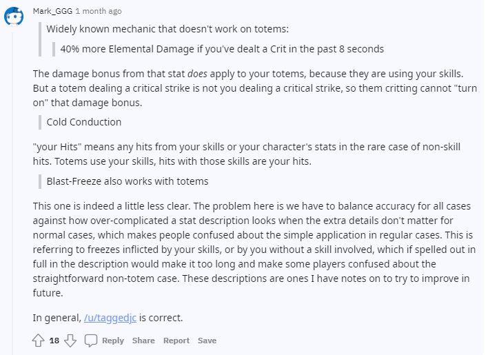 > Widely known mechanic that doesn't work on totems: > > 40% more Elemental Damage if you've dealt a Crit in the past 8 seconds The damage bonus...