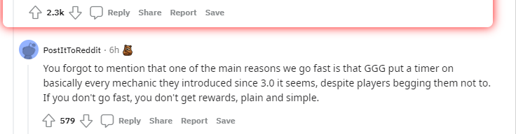 You forgot to mention that one of the main reasons we go fast is that GGG put a timer on basically every mechanic they introduced since 3.0 it seems, despite players begging them not to. If you don't go fast, you don't get rewards, plain and simple.