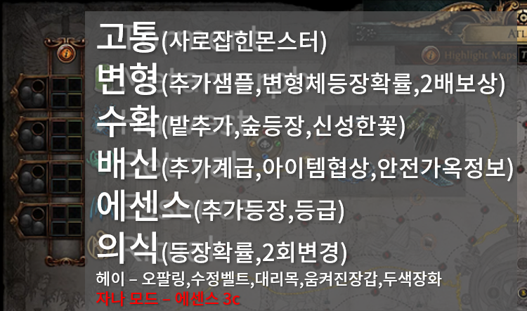 활용가능한 파밍 - 변형런, 수확런, 신디케이트, 에센스런, 의식런