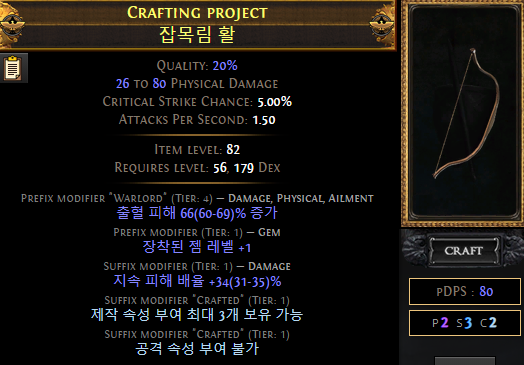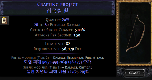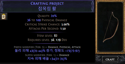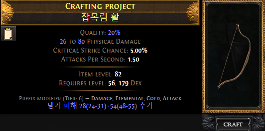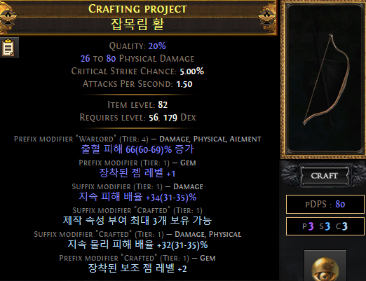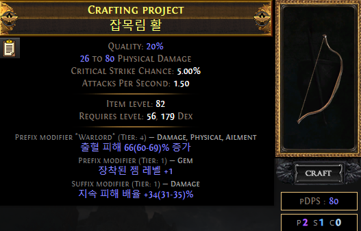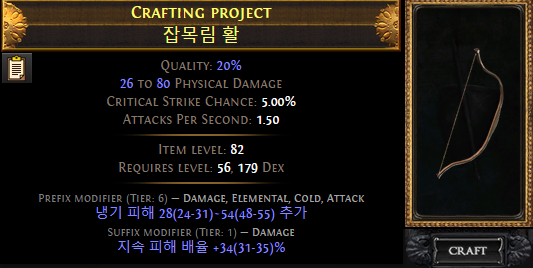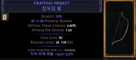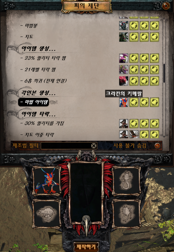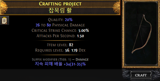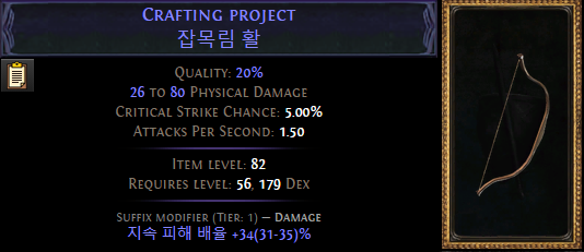 6. 마무리 크래프팅 - 제작 속성 제거 정제의 오브 1개, 멀크 엑잘 2개, 보조 젬 레벨 엑잘 2개, 지속 물리 피해 배율 카오스 4개