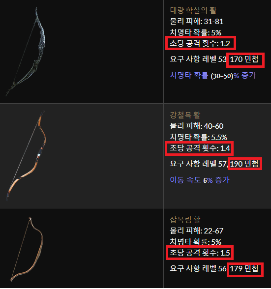자신의 민첩 수치에 착용할 수 있는 활 중 공격 속도가 제일 빠른 것을 추천.