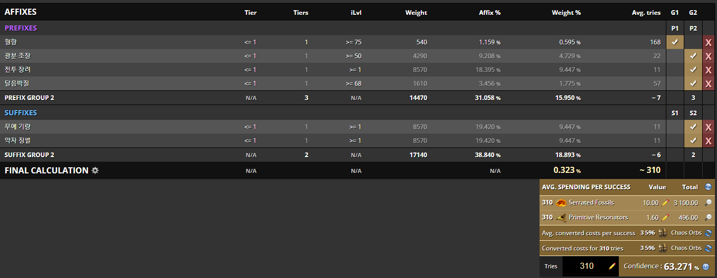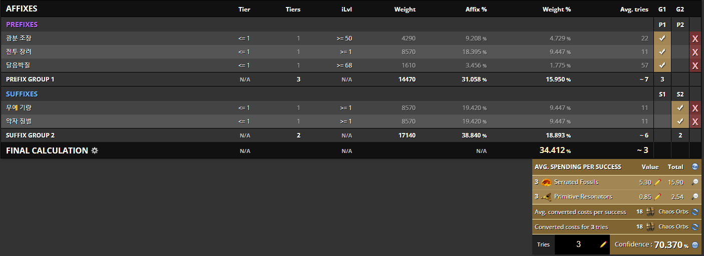 수확 공격 리롤 적당히 돌려서 접두 3개 중 2개, 접미 2개 중 1개 뽑으면 됨.