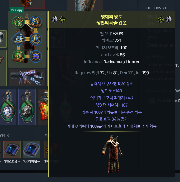 갑옷은 사냥꾼 공물 효과 증가 옵션 고양시키고, 대속자 명중 시 격분 충전 합치면 됨.