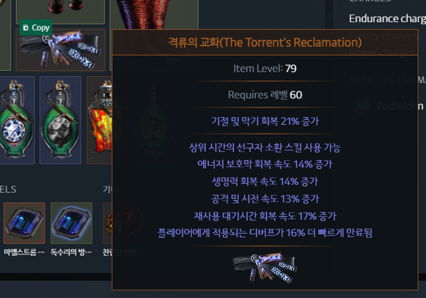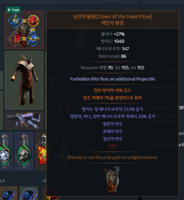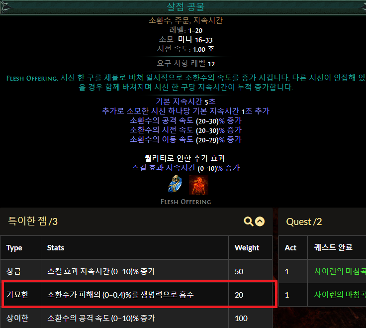 금지된 의식 투사체 추가 발사 인챈트 뚜껑에 받은 피해 생명력 회복 스컬지 옵션.