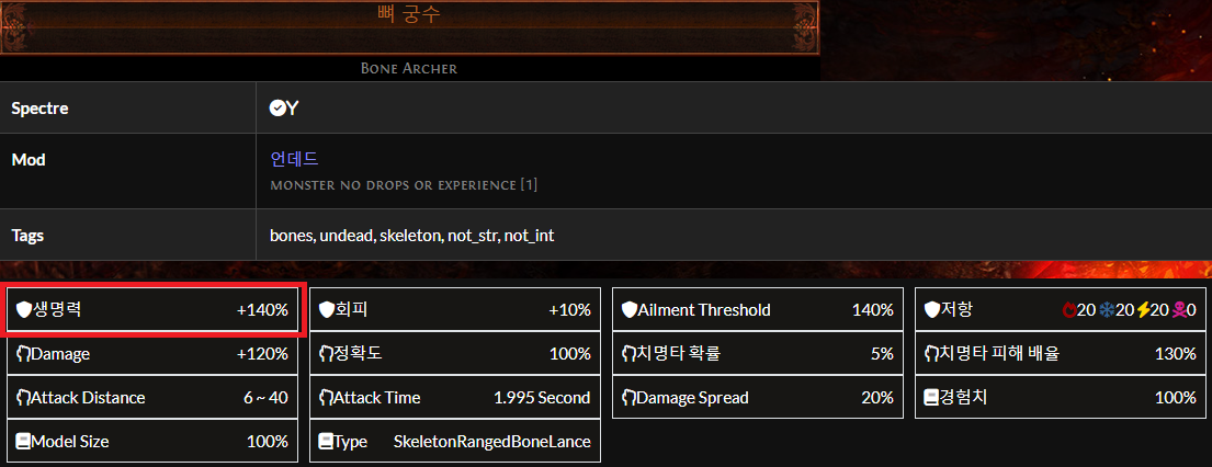 뼈 궁수는 생명력 +140%를 가지고 있음 => 240%의 생명력