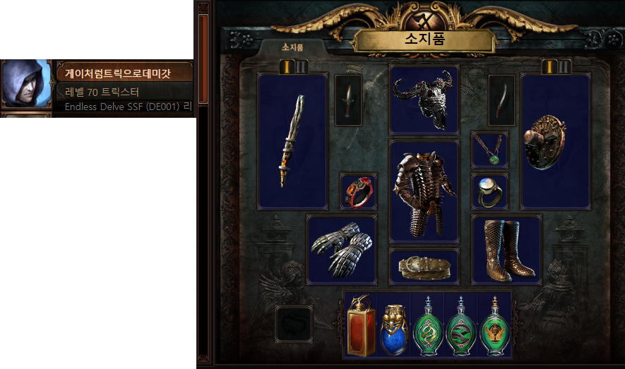 이것도 세팅 끝났었고, 아님 본캐 템 벗겨서 그대로 입히기만 해도 데미갓 확정이었는데 그냥 재밌어서 엘리로 민 거임.