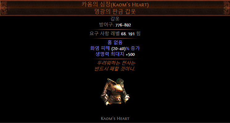 화염 격발은 자해딜같은거 안 받기 때문에 기본적으로 좋은 편이긴 한데 갑옷 선택이 자유로운 편이라서 이렇게 카옴의 심장을 입거나 아예 황동 철갑처럼 방어 스탯을 극단적으로 챙기는 방식을 사용할 수 있다.