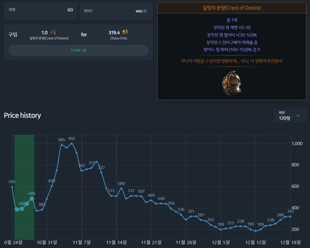 애초에 드랍률이 낮아 물량 자체가 적어서 시세가 요동치니 운이 좋게 가격이 싸게 형성되어 있을 때 사서 써먹으면 됨.