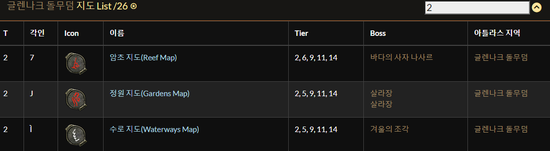 클리어한 지도만 드랍된다는 규칙으로 2 티어 지도는 정원 지도만 완료