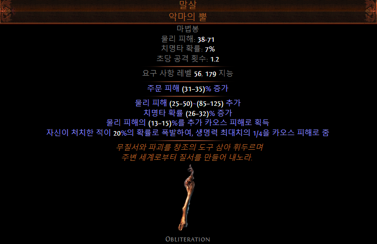 마지막 줄 옵션을 보면 20% 확률의 시폭 그리고 생명력 최대치의 1/4 ( 25% )의 카오스 피해.