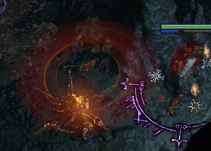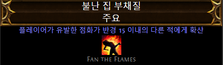 점화 확산은 베렉같이 한 방에 쓸어버리지는 못하지만 점화된 적이 죽더라도 시체 상태에서 점화 지속시간 동안 오라를 유지하고 있기 때문에 시간차를 두고 등장하거나 중간중간 범위에 벗어나서 흘린 몹들이 나를 공격하기 위해 접근할 때 점화 확산의 화상 피해로 죽일 수 있다.