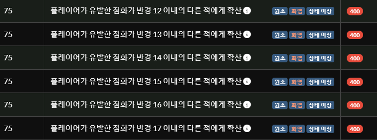 단점 : 점화 피해에 영향 하나도 안 주는 시전 속도를 올리지 않으면 풀 스택을 못 쌓음.