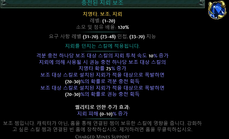 궤적 지뢰 보조로 지뢰로 변경, 격분 최대치를 늘렸으니 투척 속도를 위해 충전된 지뢰 보조를 사용.