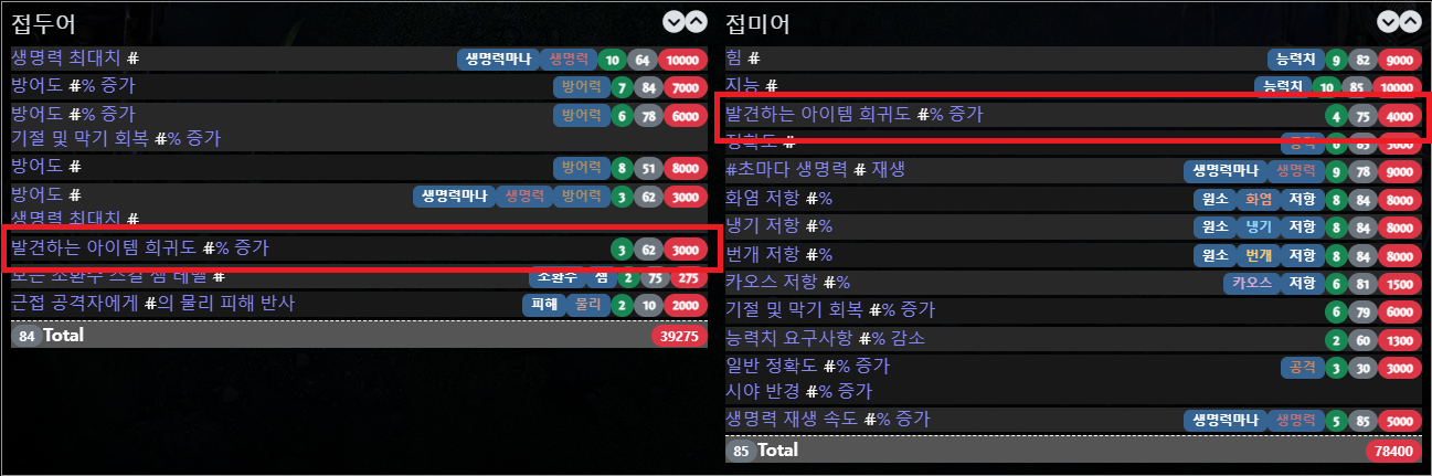 접두가 훨씬 뽑기 쉽고, 접미에 에센스로 마나 점유 효율을 붙인다거나 카오스 저항을 챙기는 경우가 많으므로