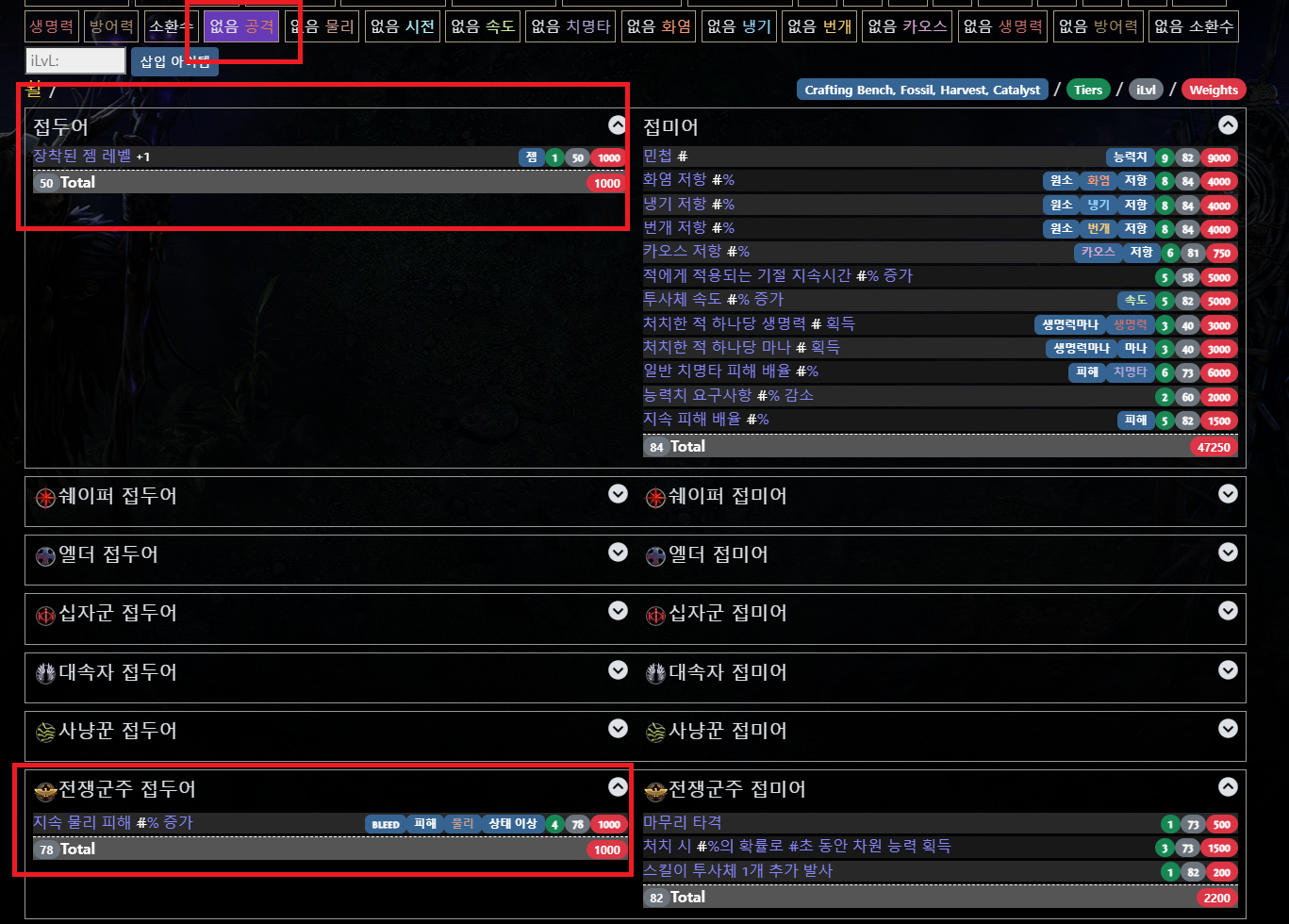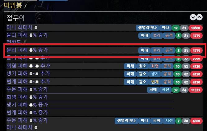 공격 속성 부여 불가 박아두면 접두 장착된 젬 레벨이랑 지속 물리 피해 증가 확정으로 나옴