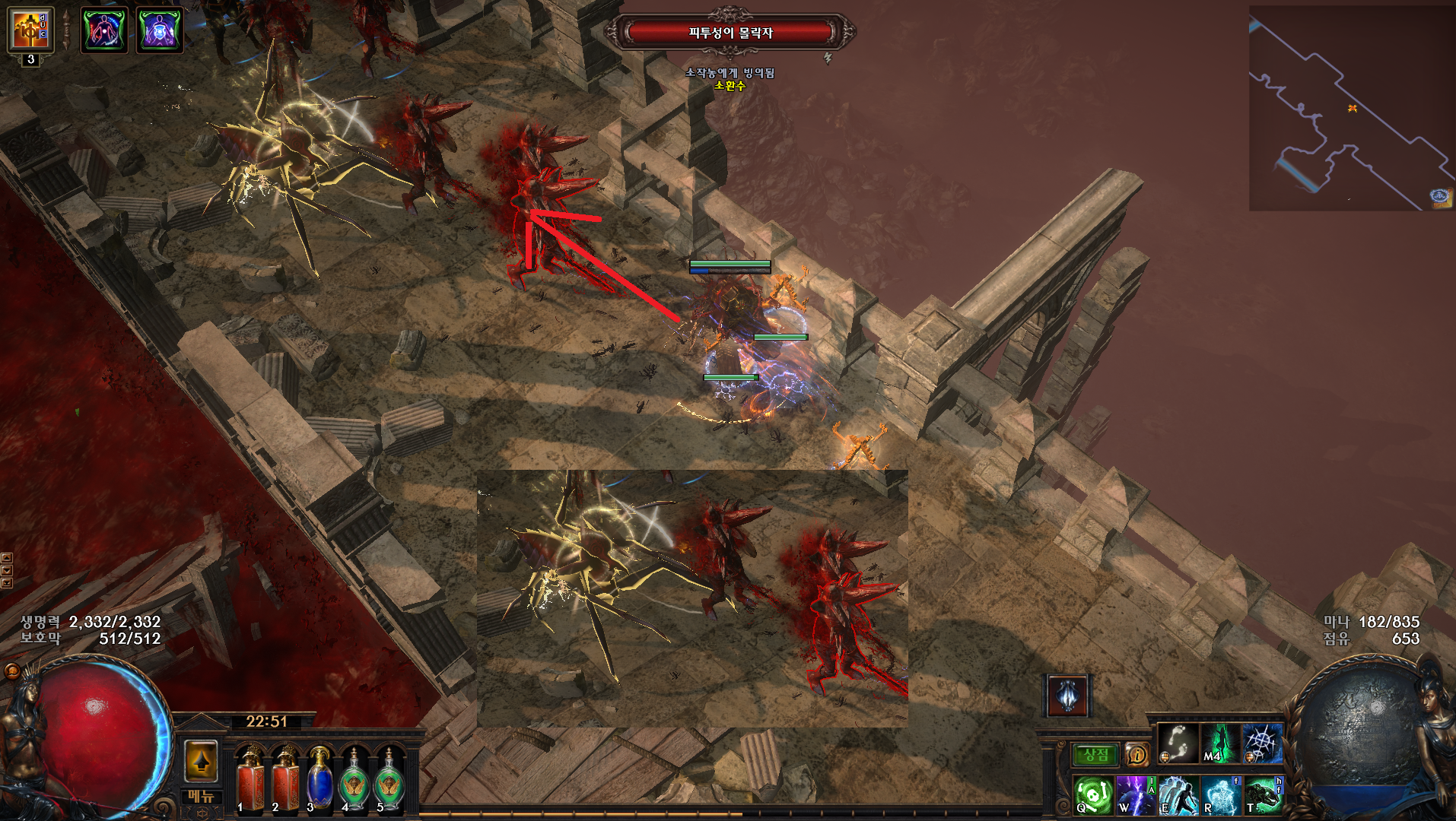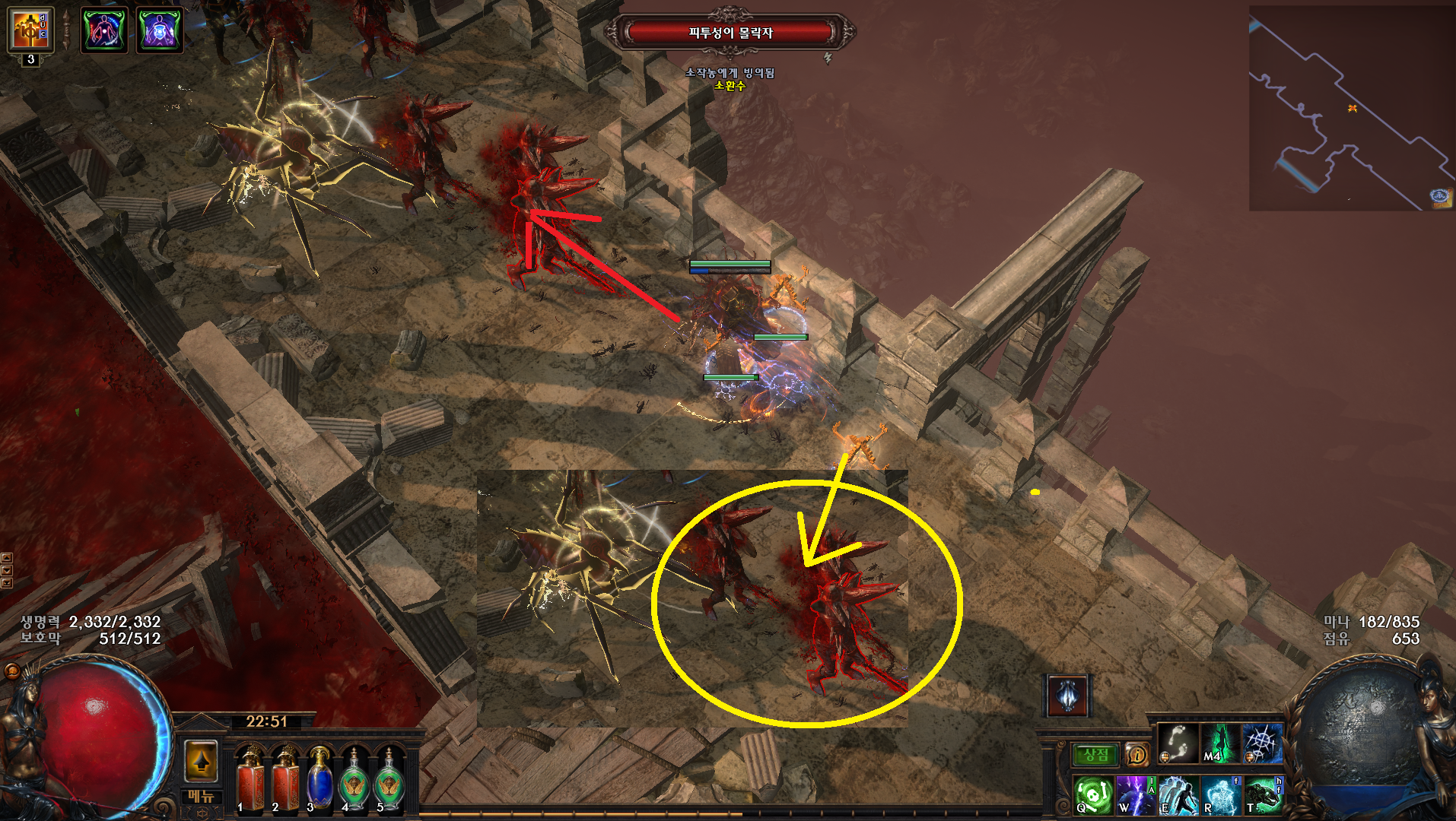 즉, 딱히 몹을 노리지 말고 주변에 투사체를 적당히 흩뿌려서 공격이 명중만 하면 지가 알아서 때림.